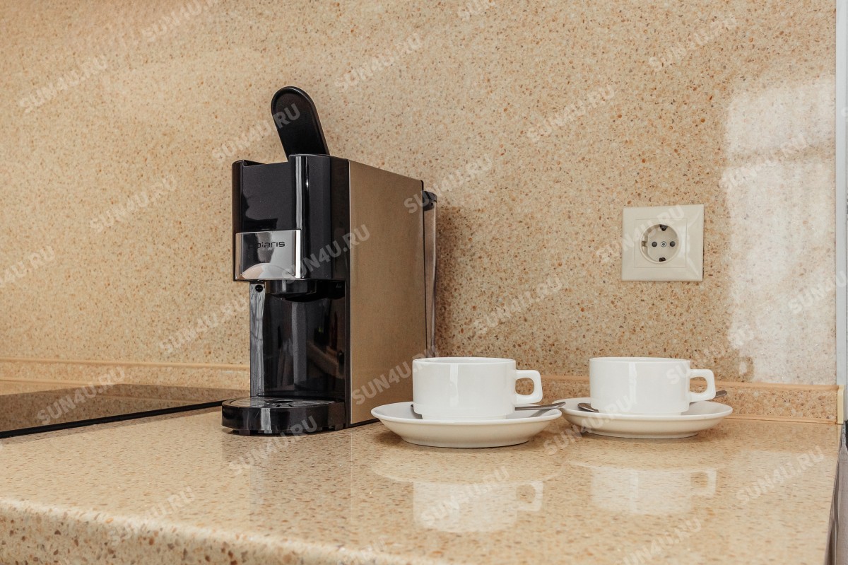 Сам апартамент оснащён всем необходимым для проживания, как на короткий, так и длительный срок. В отличии от других подобных апартаментов, имеется полноценная кухня со всеми кухонными принадлежностями. Так же в номере имеется стиральная машина, СВЧ печь (микроволновка), капсульная кофемашина, утюг, гладильная доска и сушилка, фен, кондиционер, телевизор с плоским экраном и спутниковыми каналами, бесплатный интернет. Немаловажно знать, то что апартамент шумоизолирован и шума с улицы, при закрытых окнах не слышно.