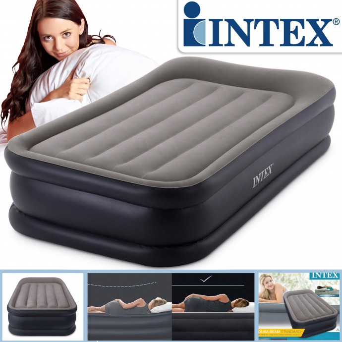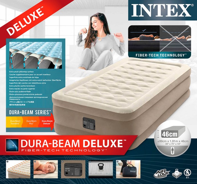 Новая роскошная ортопедическая надувная односпальная кровать Intex с повышенной и устойчивой платформой. Внутренняя конструкция по технологии Dura-Beam сохраняет форму изделия и обеспечивает равномерное распределение воздуха, придавая кровати необходимую жёсткость и стабильность для комфортного отдыха и повышенной надёжности. Верхний специальный слой делает поверхность более упругой и долговечной. Флокированное покрытие, напоминающее велюр, препятствует скольжению постельного белья и легко очищается. Кровать компактно складывается и удобно хранится — в сложенном виде занимает мало места в багаже и на полке. Установка занимает всего около 3 минут. Модель входит в число самых популярных. Встроенный электрический насос и сумка для переноски входят в комплект.